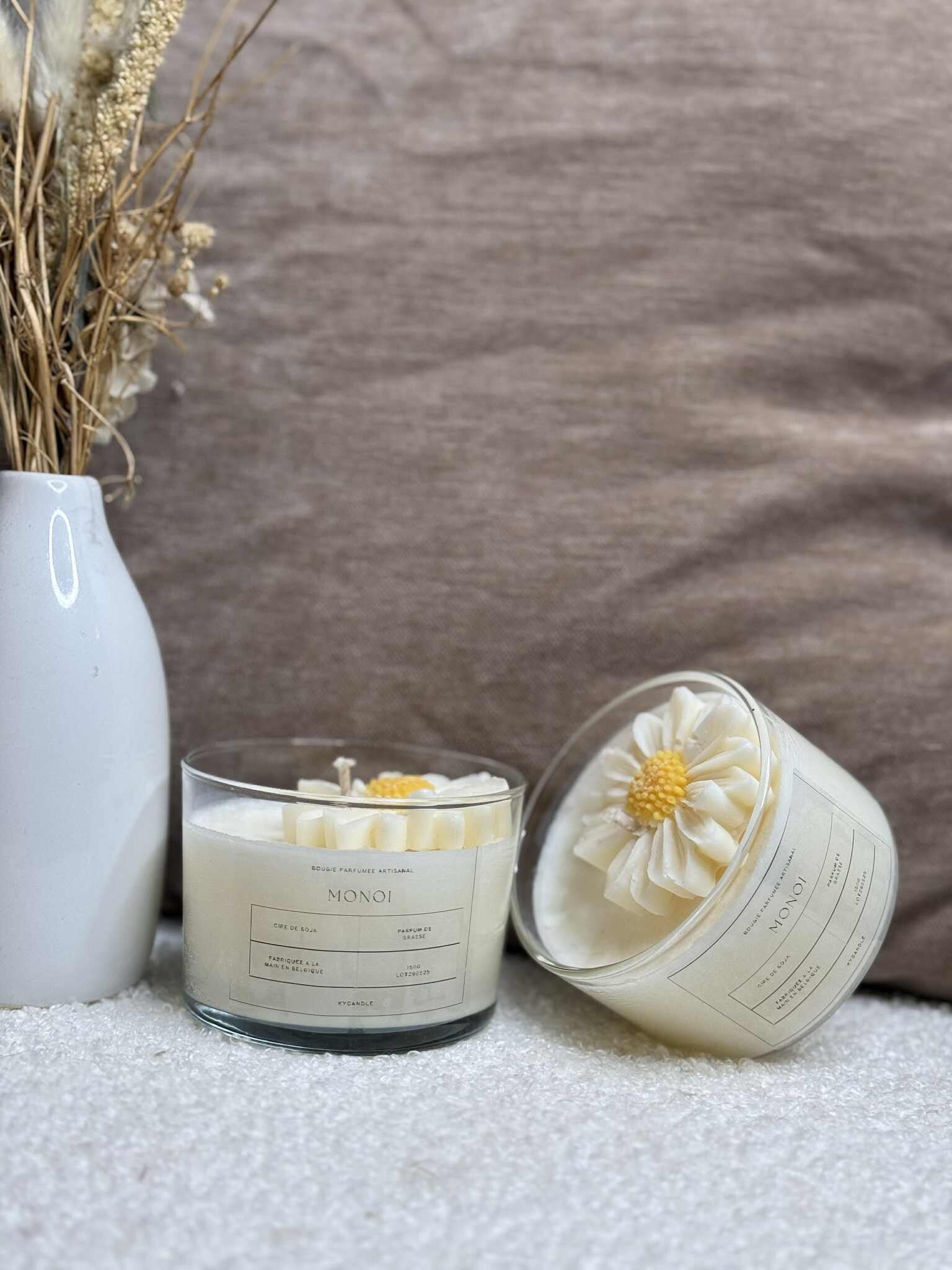 Laissez-vous envoûter par cette bougie au charme délicat, ornée d’une fleur en cire faite à la main. Son parfum de monoï, doux et solaire, évoque la peau chaude après une journée d’été.