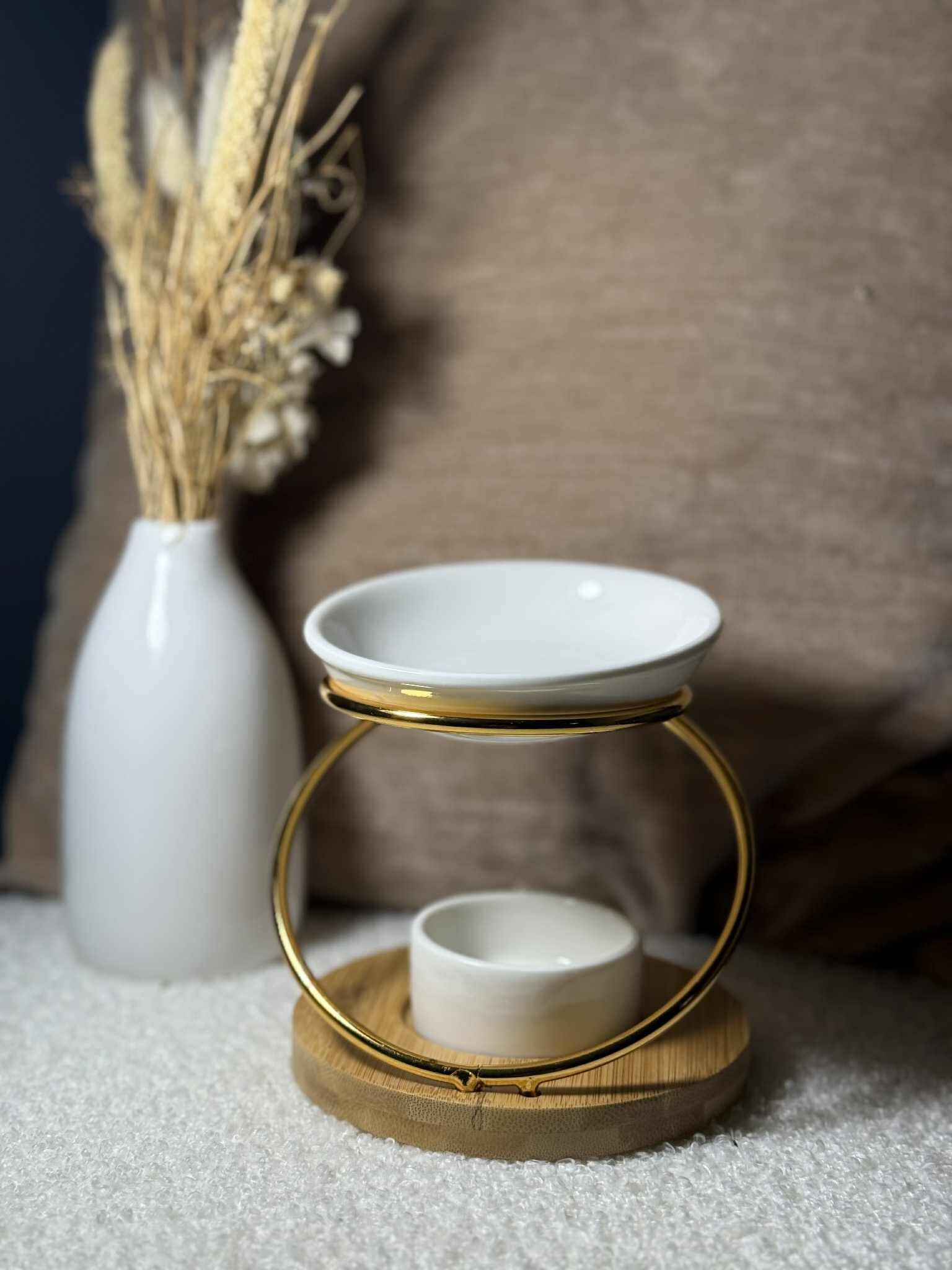 Alliez modernité et chaleur avec ce diffuseur raffiné composé d’un socle en bois naturel, d’un anneau doré élégant et d’une coupelle en céramique blanche. Son design circulaire en fait une pièce décorative originale qui attire le regard tout en diffusant une lumière douce et réconfortante.